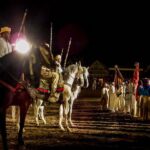 At the end of this magical evening, you will find the witness of reconstruction war scenes on horseback from the first battles between the ancient Berbers and the knights of the desert. In a deafening noise of explosions and smoke, entire troops of riders dressed in their traditional uniforms compete in the arena. To close the show, a gigantic fireworks display will light up the sky.